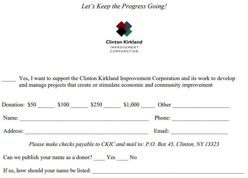 Please join your neighbors in supporting the Clinton Kirkland Improvement Corporation’s (CKIC) continuing efforts to plan and implement a variety of improvements in our community.